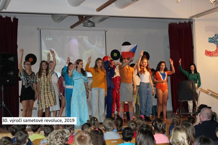 K 30. výročí sametové revoluce jsme se rozhodli s žáky 8. a 9. tříd uspořádat přehlídku oděvů, jež se nosily v 70. a 80. letech minulého století. Přehlídka byla doplněna prezentací fotografií z této doby. Nad použitými, dnes už historickými snímky se žáci ohromně pobavili, protože poznávali své učitele, kteří na nich byli ještě mladí nebo děti. Příprava nám zabrala opravdu dlouhou dobu. Učitelky 1. a 2. stupně prohledávaly sklepy, půdy, ptaly se svých známých, rodičů, a tak se nám podařilo nashromáždit skutečné poklady. Na přehlídce jste mohli obdivovat šaty pro slavnostní příležitosti, ve kterých některé kolegyně maturovaly nebo promovaly. Dále jsme představili diskotékové kreace, modely do mrazivého počasí včetně zimního sportovního vybavení, teplákové soupravy, dresy, které pamatovaly spartakiádu z roku 1980 a 1985. Podařilo se nám nashromáždit několik pionýrských krojů včetně kroje pro pionýrskou vedoucí. Některé paní učitelky si po několik desetiletí schovávaly na památku svatební šaty, které se nám také moc hodily. Modelkám nechyběly doplňky jako kabelky, síťovky, brýle či šperky. A pamatujete si, v jakém stejnokroji nás ošetřovaly v nemocnicích zdravotní sestřičky nebo co měl na sobě mistr ve výrobní dílně? To všechno si s námi návštěvníci připomněli a možná se v myšlenkách ocitli o více než třicet let zpátky v čase. Představení bylo doplněno dobovými hity a znělkami československé televize. Úspěch měli naši žáci obrovský, pochvalu si zasloužili nejen od učitelů, spolužáků, rodičů, ale i od zástupců města Litovel i Muzea Litovel.