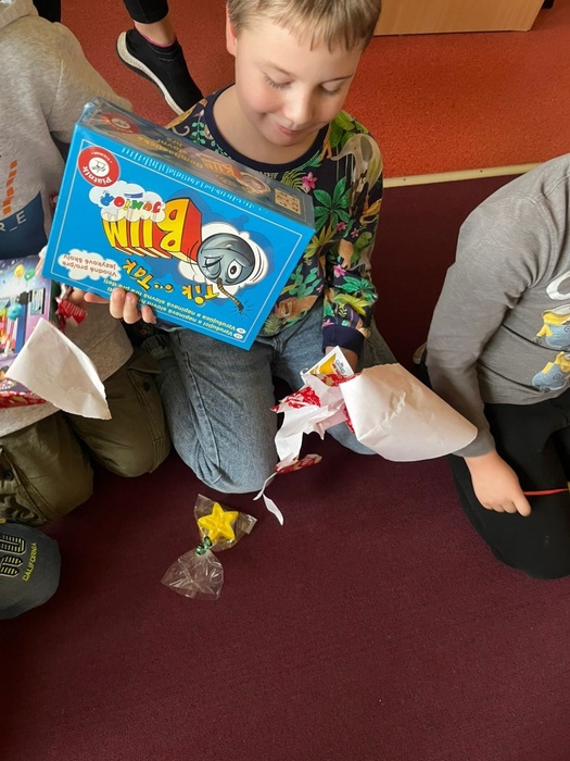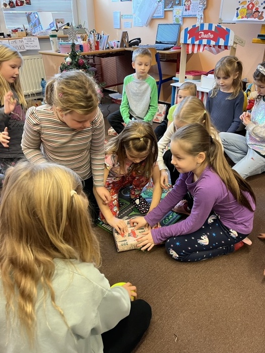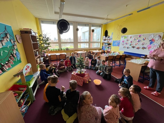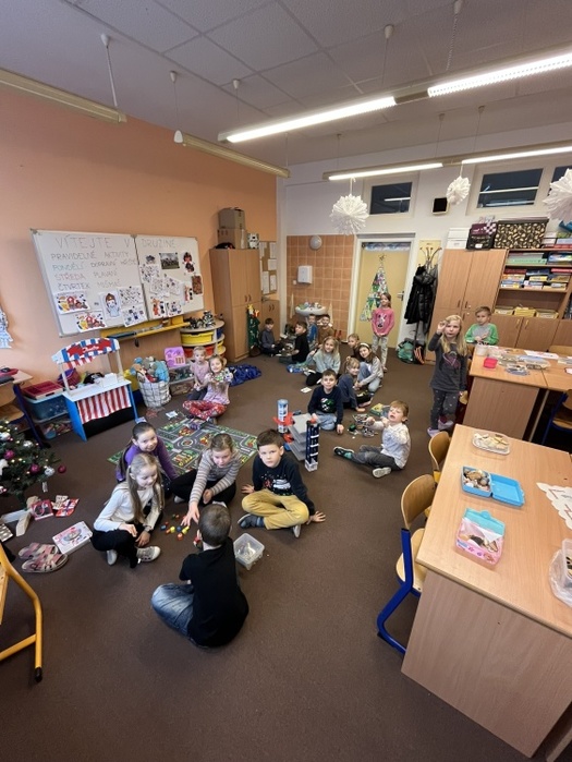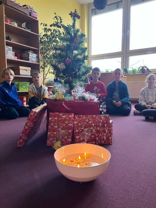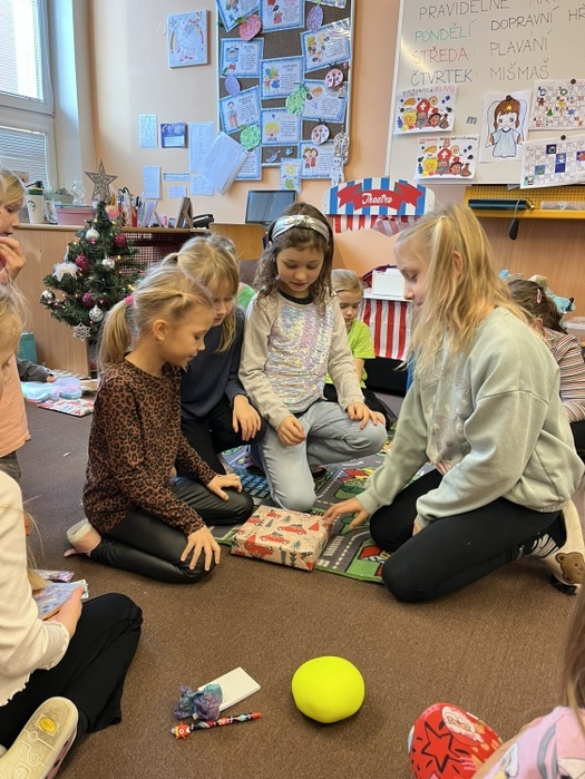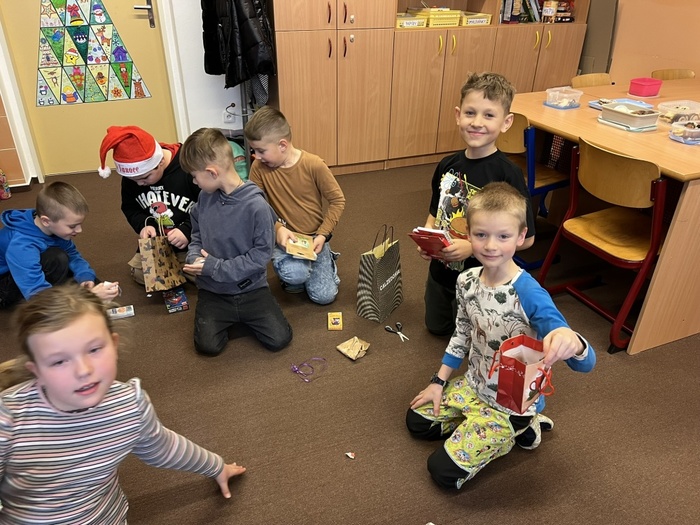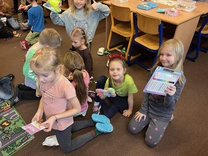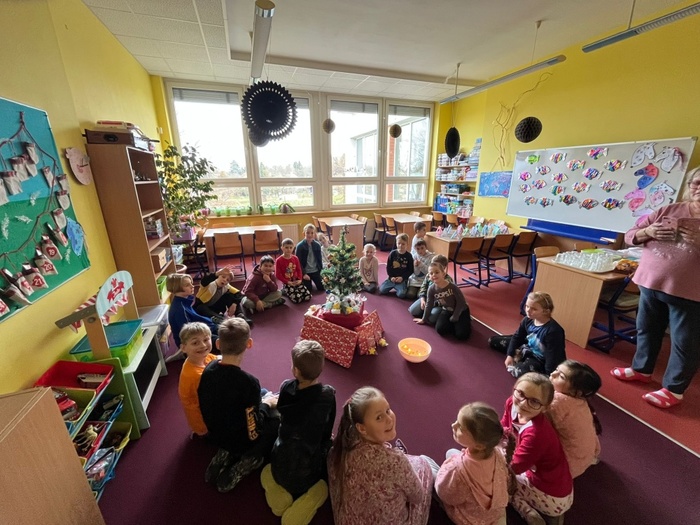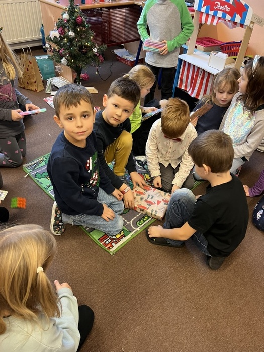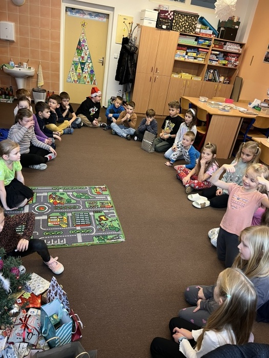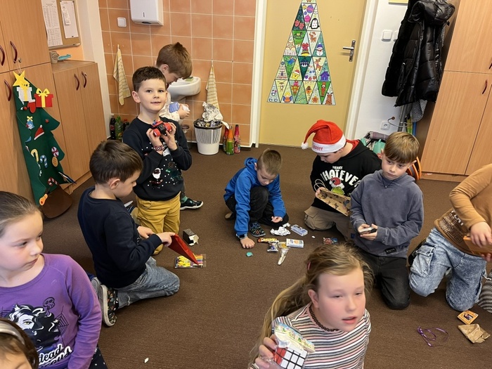 Ukončení roku 2024 - vánoční besídky v družinkách. Každá družina si udělala vánoční besídku, děti si nadělovaly dárečky jak mezi sebou, tak do každé družinky přiletěl i Ježíšek a donesl nové hračky. Nechybělo ani dětské šampaňské na přípitek a ochutnávka cukroví od maminek. Každé oddělení si užilo své vánoční odpoledne po svém a všichni byli spokojení.