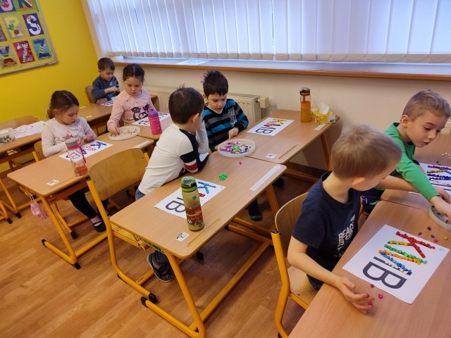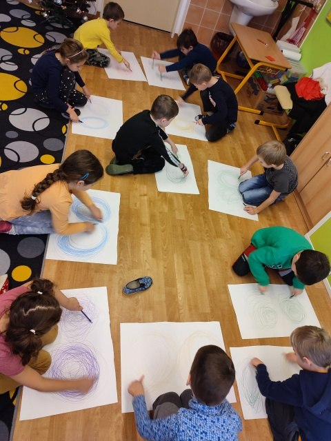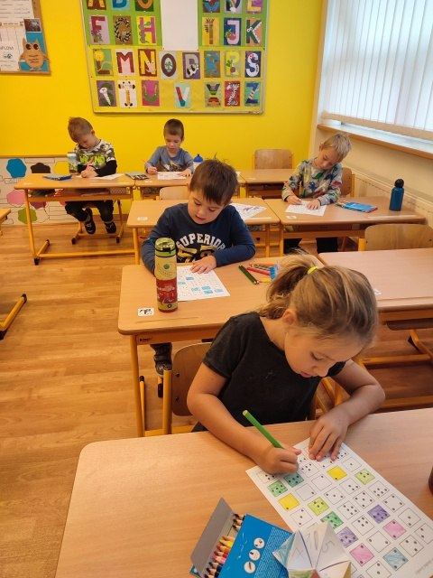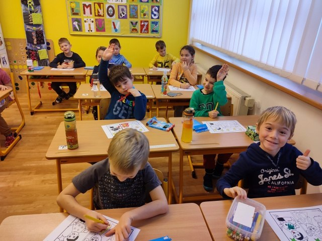 Dbáme již i na správné sezení, úchop tužky, učíme děti uvolňovací cviky. Každodenně za dětmi přichází školní psycholožka, která pomáhá dětem dosáhnout rovnováhy ve fungování těla i psychiky. Celé dopoledne dodržujeme ohraničení aktivit, aby si děti postupně navykaly na školní režim. Každý den do programu zařazujeme hodinu, jež je přizpůsobena aktuální situaci ve třídě, individuálním potřebám, nebo je věnována hře, vycházce, návštěvě hřišť, výstav apod. Výuka končí v 11:45. Následně mají děti možnost navštěvovat školní družinu.