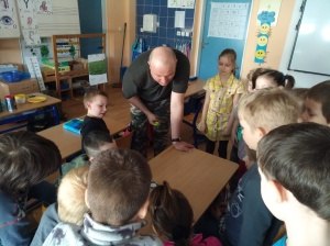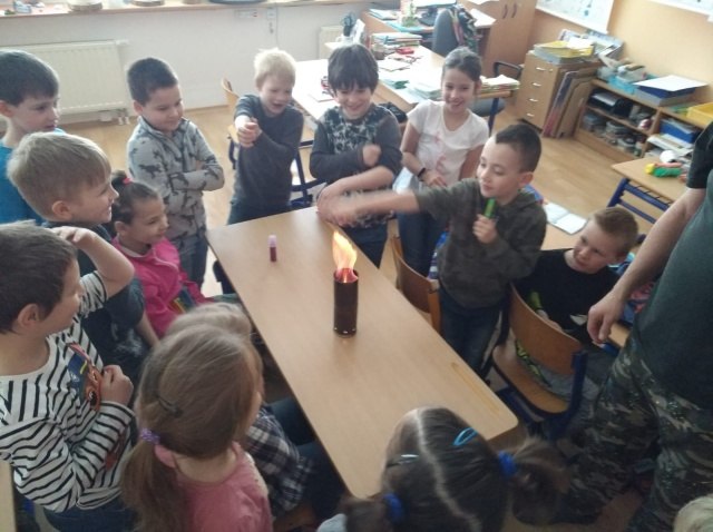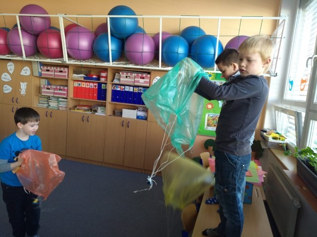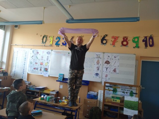 Po roce nás opět navštívil pan Radek Chajda se svým programem Hravá věda. Díky tomu děti na 1. stupni zažily malý "letecký den", protože pokusy byly tentokrát zaměřeny na letecké téma. Názorně jsme viděli, že horkovzdušný balón je možné snadno vyrobit i ze sáčků na odpadky. Létající sáček se svíčkami pak mnozí mladí experimentátoři jistě i doma vyzkoušeli. Létal dokonce i kapesník. Ti zručnější vyrobili papírovou foukací raketku, aby si porovnali s ostatními, kdo je lepší konstruktér. Třídou zasvištěla i lihová raketa, které už neměla daleko k těm opravdovým. Na závěr si zalétali i naši plyšáci a plastové figurky, kterým jsme zhotovili padáky ze sáčků.