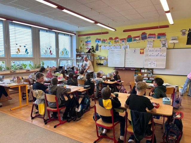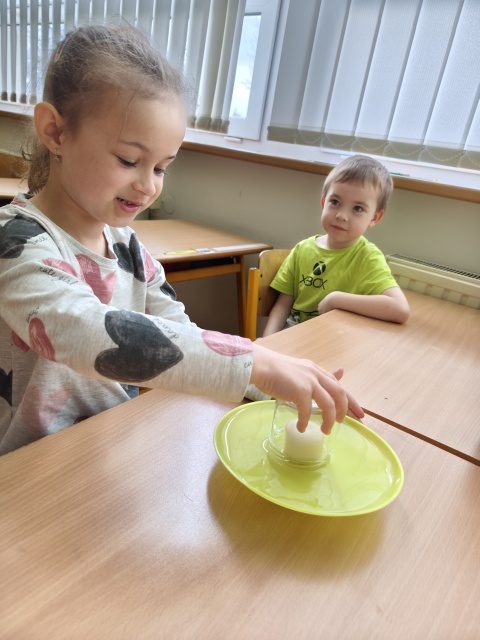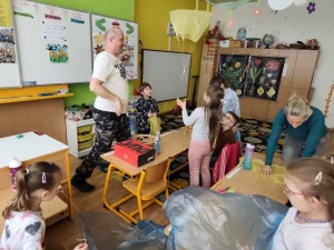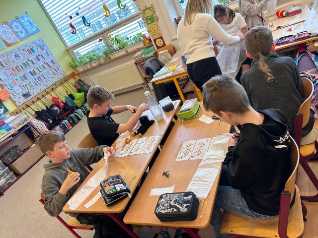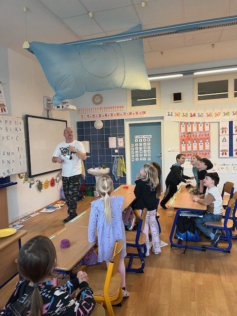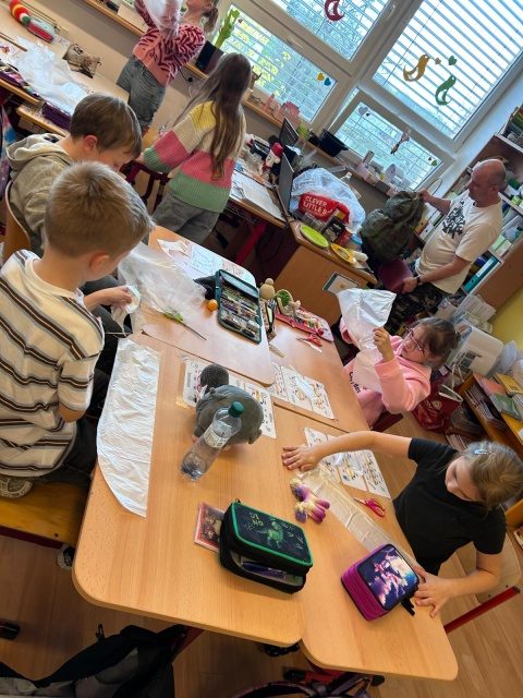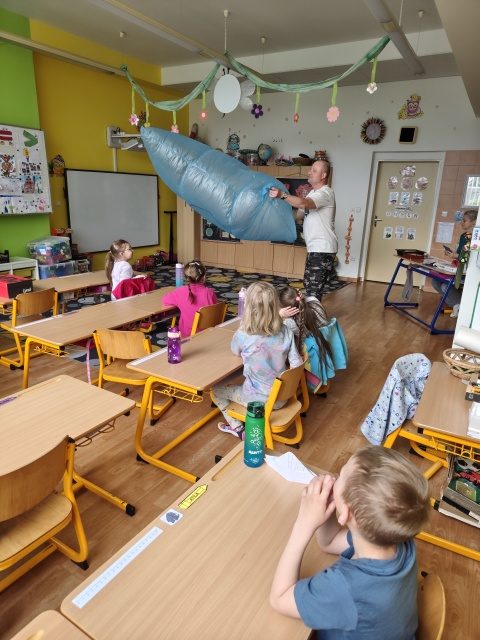 V jarních dnech opět zažili žáci 1. - 4. tříd zážitkovou hodinu Hravé vědy, zaměřenou na názorné poznávání hravou formou. Tentokrát před jejich překvapenýma očima létal horkovzdušný balon z odpadkových sáčků, vznesl se i pokreslený sáček a papírový kapesník. Mírný úlek nastal, když třídou prosvištěla raketa z PET láhve, ale vše dobře dopadlo. Při skupinové práci si děti vyzkoušely, jak reaguje svíčka na přísun kyslíku. Pomocí komínu z ustřižené láhve byla svíčka nejprve mírně přidušena, poté se znovu rozhořela. Při dalším experimentu se sklenička, jíž byla přiklopena svíčka, přisála k talířku díky vzniklému podtlaku. Na závěr si každý vyrobil sáčkový padák pro svého plyšového či plastového parašutistu – stříhání a zavazování uzlů na provázcích dalo některým pořádně zabrat.