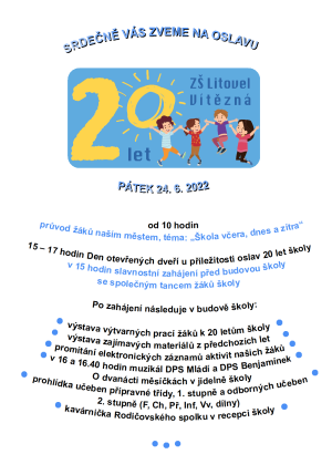 Vyvrcholení těchto oslav nastane v pátek 24. 6. 2022, a to od 10.00 hodin průvodem žáků naším městem. V odpoledních hodinách od 15.00 do 17.00 hodin bude pokračovat Dnem otevřených dveří. Ten začne v 15.00 hodin před budovou školy. Můžete se těšit na spoustu zajímavostí, např. na společný tanec žáků…