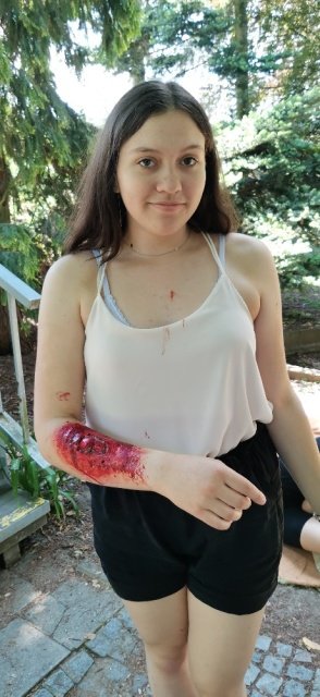 Chvilku poté, co jsme dorazili a usadili se, si nás vyžádali maskéři a začali z nás dělat zraněné osoby. Bylo mi přiděleno zranění popáleniny dlaní. Nejhorší na tom bylo, že jsem se celý den nemohla na nic sáhnout, krmit mě museli druzí. Cítila jsem se doslova jako bez rukou. Nevím, co bych dělala, kdyby se mi něco takového opravdu stalo. Byl to tedy nevšední zážitek.