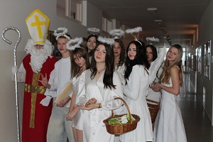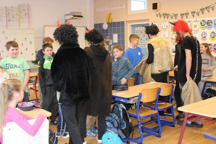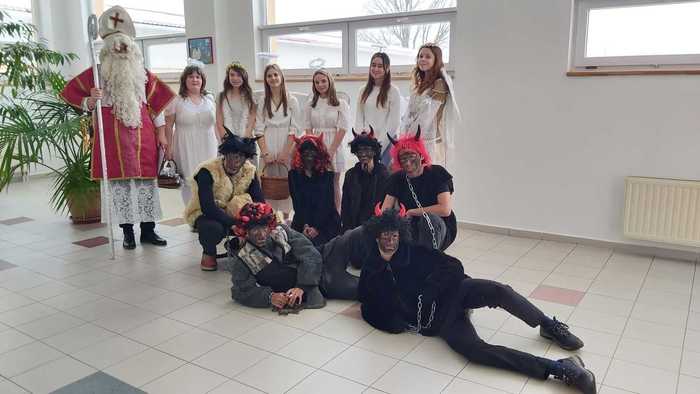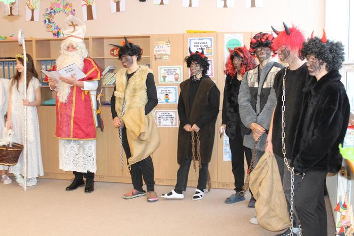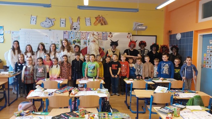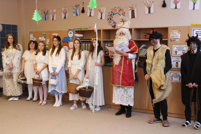 V letošním školním roce přišel Mikuláš se svými anděly a čerty za dětmi do jejich tříd. Protože máme 26 tříd, školou procházely dvě mikulášské družiny. Ty přišly za žáky, aby hodné děti odměnily. Ti, co někdy zazlobí, sami sobě slíbili, že se napraví.